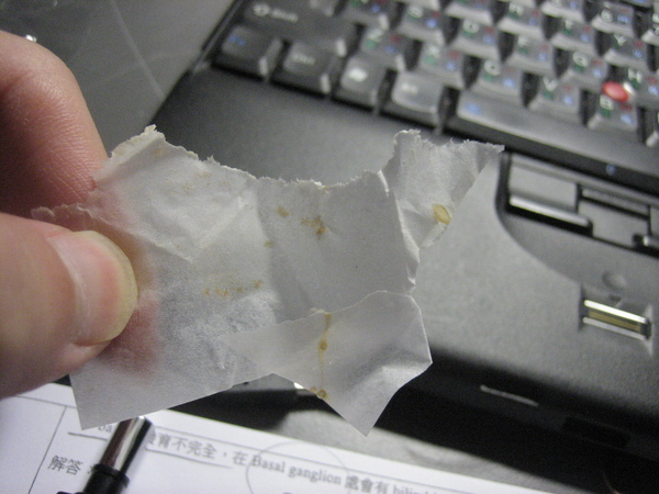 下午在吃魯肉XX餅... 邊吃邊看別人網誌上的旅遊文章吃起來口感奇特,有一小片一小片不易嚼爛的東西,由於不曾吃過所以也不疑有它,待吃到一半的時候低頭一看才發現........一張有齒痕的紙在手上!!!!!!!!!!!!!由形狀看來.... 應該是吃了一半以上了!!!現在頭痛痛的...該不會是紙上有啥鬼東西吧